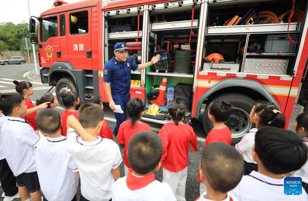 A firefighter (back) introduces firefighting equipment to students at a primary school in Longyan City, southeast China's Fujian Province, Sept. 1, 2023. The new school semester kicked off in many parts of China on Friday. (Photo by Zhou Yangdong/Xinhua)