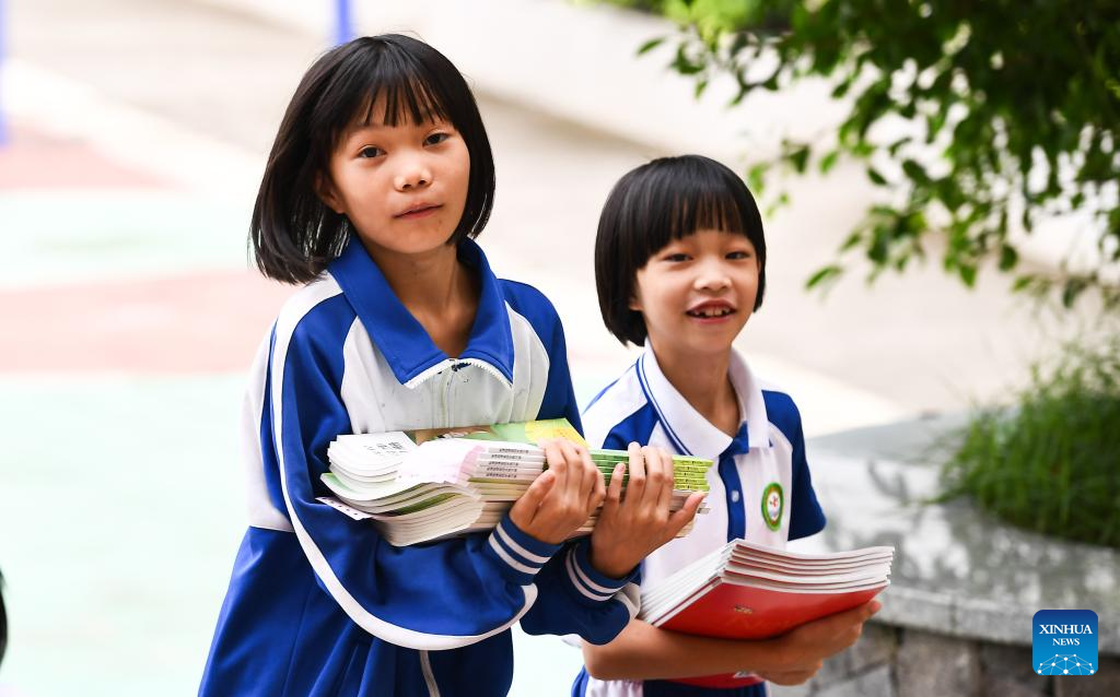 Students receive their new books at a primary school in Qiongzhong Li and Miao Autonomous County, south China's Hainan Province, Sept. 1, 2023. New school semester kicked off in many parts of China on Friday. (Xinhua/Yang Guanyu)