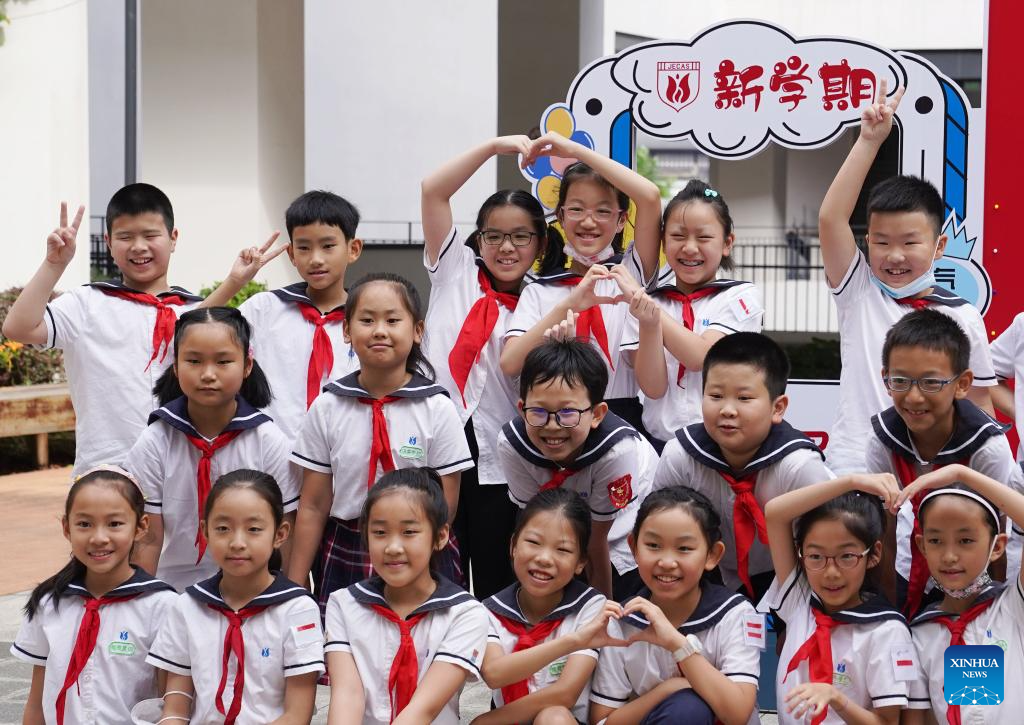 Students pose for a group photo at a school in Jing'an District of east China's Shanghai, Sept. 1, 2023. The new school semester kicked off in many parts of China on Friday. (Xinhua/Liu Ying)