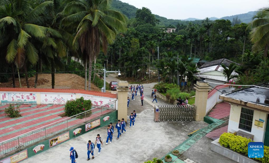 This aerial photo taken on Sept. 1, 2023 shows students walking into a primary school in Qiongzhong Li and Miao Autonomous County, south China's Hainan Province. New school semester kicked off in many parts of China on Friday. (Xinhua/Yang Guanyu)