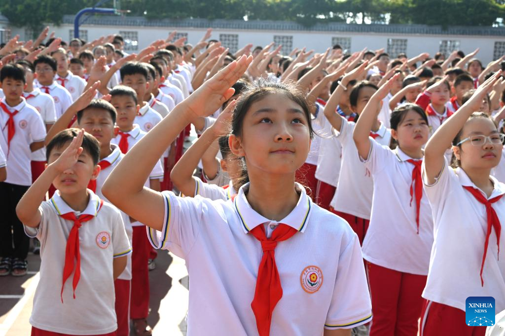 Students attend a flag-raising ceremony at a primary school in Kaifeng City, central China's Henan Province, Sept. 1, 2023. The new school semester kicked off in many parts of China on Friday. (Photo by Li Junsheng/Xinhua)