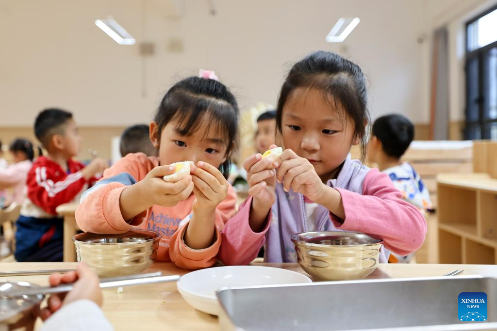 Children have breakfast at a kindergarten in Kunming City, southwest China's Yunnan Province, Sept. 1, 2023. New school semester kicked off in many parts of China on Friday. (Xinhua/Cui Wen)