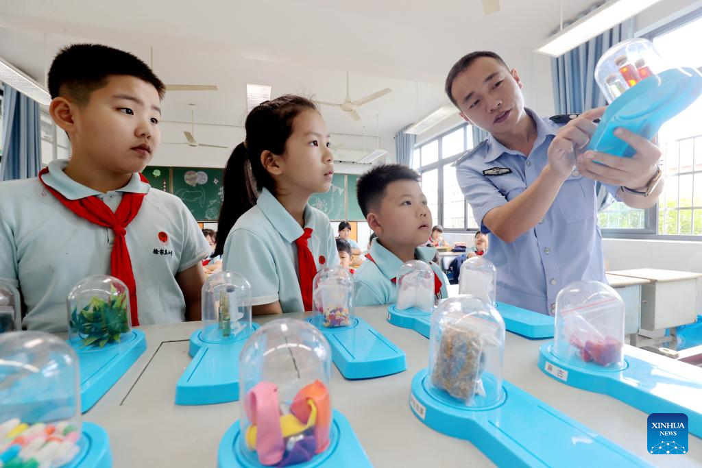 A police officer (1st R) introduces the harm of drugs at a primary school in Deqing County, east China's Zhejiang Province, Sept. 1, 2023. The new school semester kicked off in many parts of China on Friday. (Photo by Xie Shangguo/Xinhua)