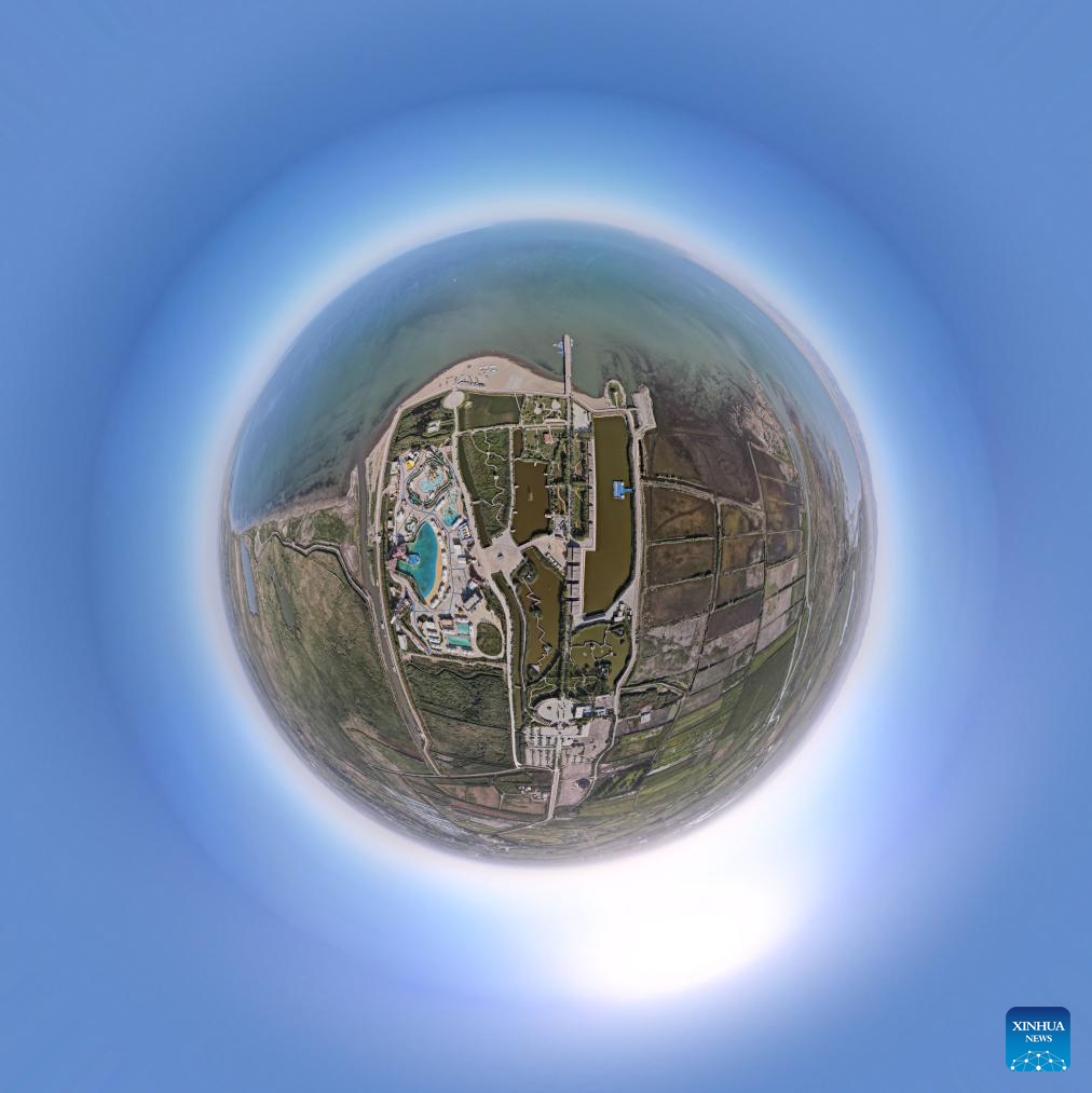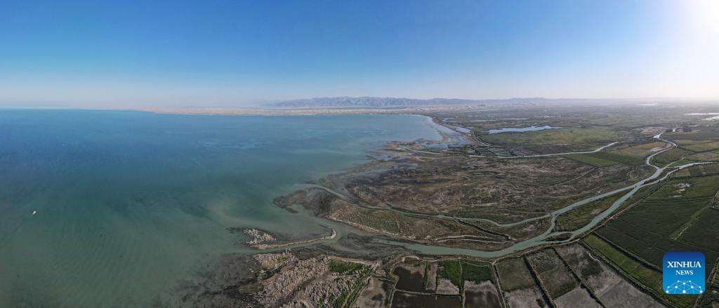 This aerial panoramic photo taken on Aug. 31, 2023 shows the Kaidu River merging into the Bosten Lake in Bohu County, northwest China's Xinjiang Uygur Autonomous Region. The Bosten Lake covering an area of 1,646 square kilometers is the largest inland freshwater lake in China. (Xinhua/Jin Haoyuan)