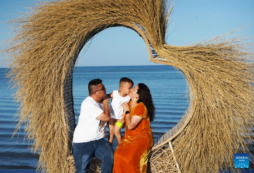 Tourists pose for photos at the Dahekou scenic spot of Bosten Lake in Bohu County, northwest China's Xinjiang Uygur Autonomous Region, Aug. 31, 2023. The Bosten Lake covering an area of 1,646 square kilometers is the largest inland freshwater lake in China. (Xinhua/Jin Haoyuan)