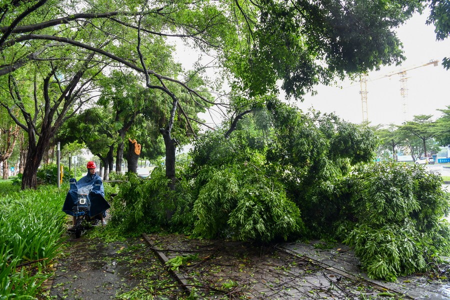This photo taken on Sept. 2, 2023 shows a fallen tree along Shennan avenue in Shenzhen, south China's Guangdong Province. (Xinhua/Liang Xu)