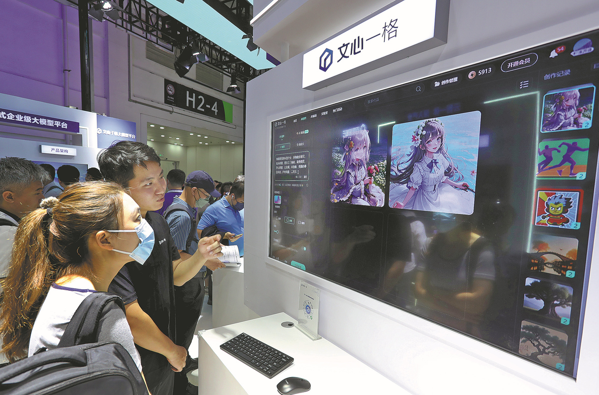 Visitors check out Baidu's large language model Ernie Bot during a high-tech expo in Shanghai in July. [Photo/Xinhua]