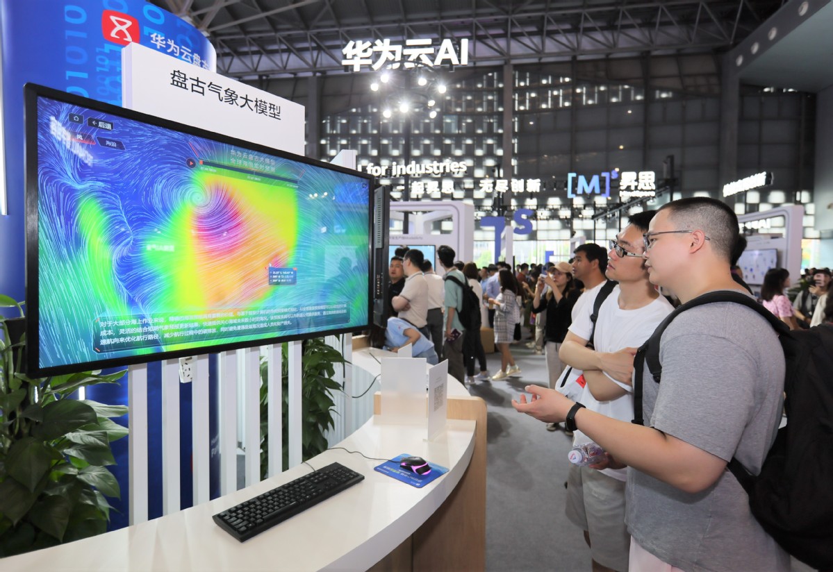 Visitors check out Huawei's Pangu-Weather, a powerful AI-based weather forecasting system, during the World Artificial Intelligence Conference 2023 in Shanghai on July 6. [Photo/Xinhua]