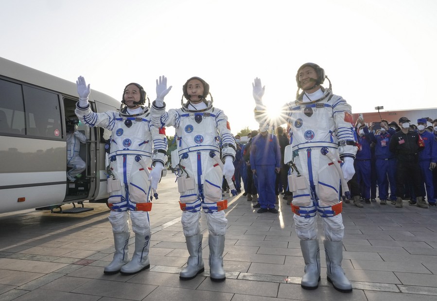 Chinese astronauts Jing Haipeng (L), Zhu Yangzhu (C) and Gui Haichao attend a see-off ceremony at the Jiuquan Satellite Launch Center in northwest China May 30, 2023. (Xinhua/Li Gang)