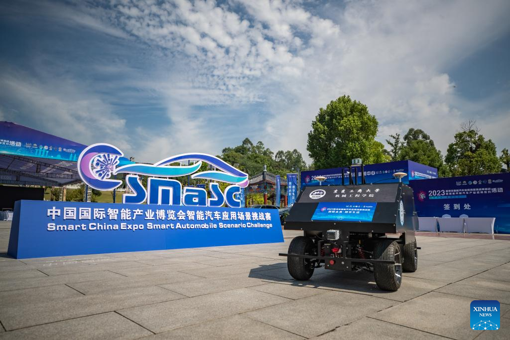 A vehicle is seen during the Smart China Expo Smart Automobile Scenario Challenge in Yongchuan District of southwest China's Chongqing, Sept. 1, 2023. The challenge was held in Yongchuan District of Chongqing from Sept. 1 to 3. More than 180 industry representatives and 19 teams from the field of intelligent vehicles participated in the competition. (Xinhua/Chu Jiayin)