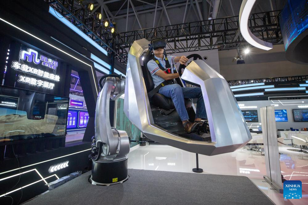A journalist experiences an in-vehicle XR intelligent cabin at the venue for 2023 Smart China Expo in southwest China's Chongqing, Sept. 3, 2023. The 2023 Smart China Expo will be held at Chongqing International Expo Center from Sept. 4 to 6. (Xinhua/Chu Jiayin)