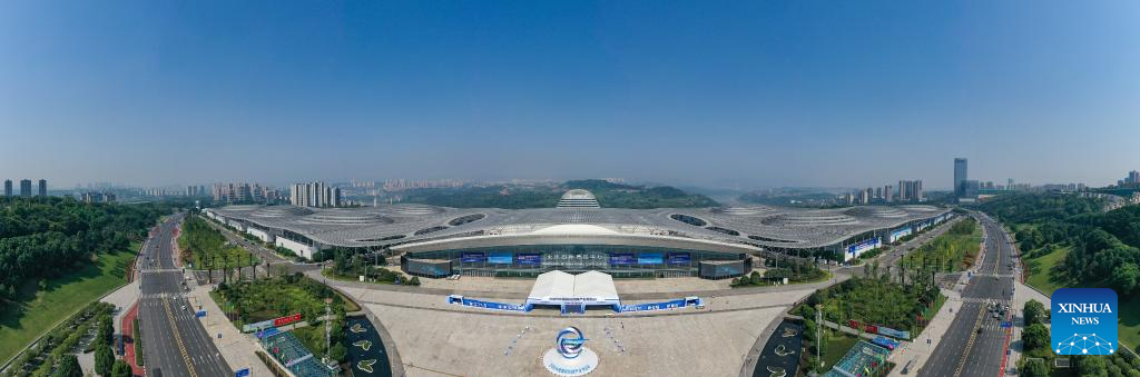 This aerial stitched photo taken on Sept. 3, 2023 shows the exterior view of the venue for 2023 Smart China Expo in southwest China's Chongqing. The 2023 Smart China Expo will be held at Chongqing International Expo Center from Sept. 4 to 6. (Xinhua/Huang Wei)