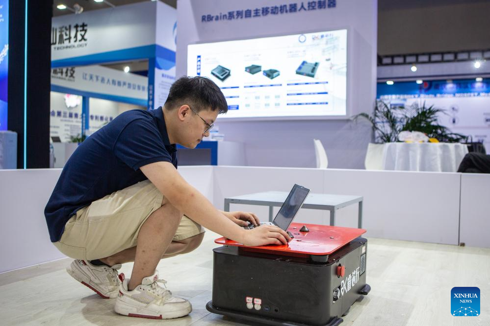 An exhibitor debugs an autonomous mobile robot at the venue for 2023 Smart China Expo in southwest China's Chongqing, Sept. 3, 2023. The 2023 Smart China Expo will be held at Chongqing International Expo Center from Sept. 4 to 6. (Xinhua/Chu Jiayin)