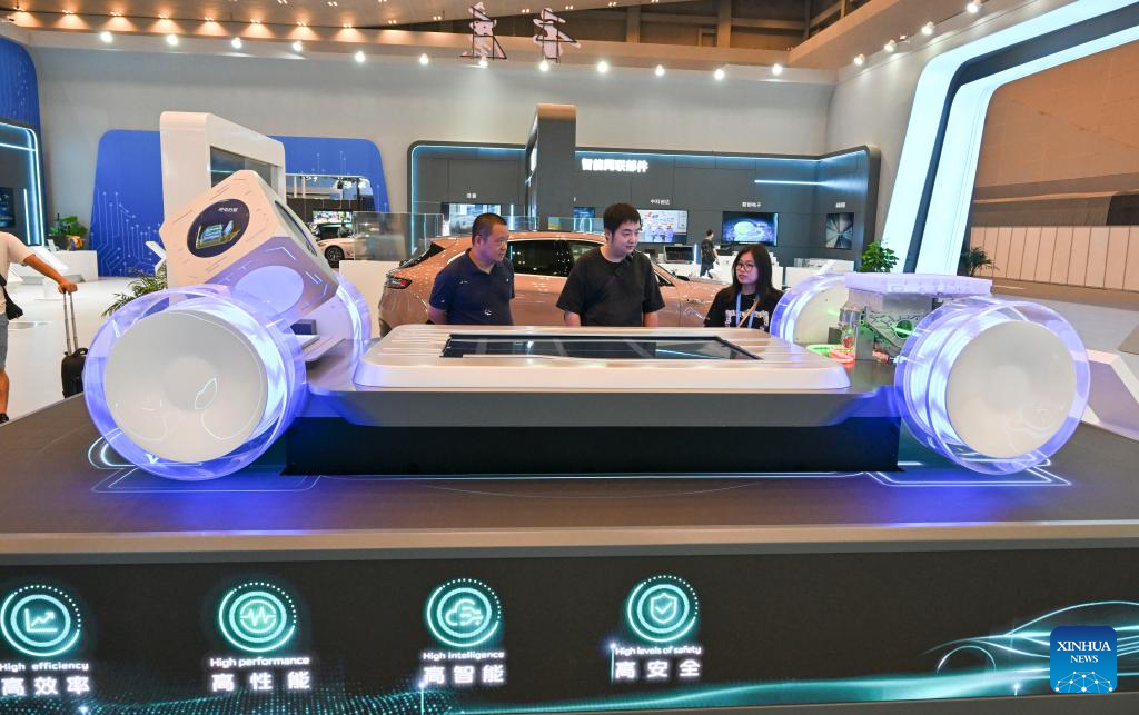 Visitors look at a skateboard chassis used on smart vehicles at the venue for 2023 Smart China Expo in southwest China's Chongqing, Sept. 3, 2023. The 2023 Smart China Expo will be held at Chongqing International Expo Center from Sept. 4 to 6. (Xinhua/Huang Wei)
