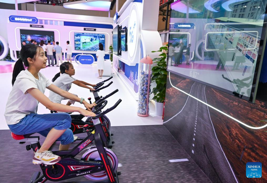 Children experience digital device at the venue for 2023 Smart China Expo in southwest China's Chongqing, Sept. 3, 2023. The 2023 Smart China Expo will be held at Chongqing International Expo Center from Sept. 4 to 6. (Xinhua/Wang Quanchao)
