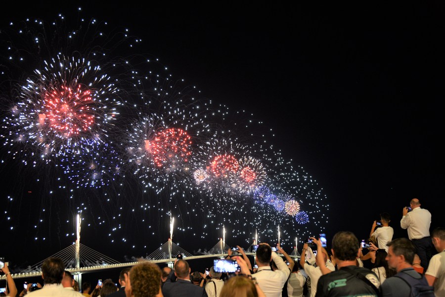 People watch a fireworks show during the inauguration ceremony of the Peljesac Bridge in Komarna, Croatia, July 26, 2022. (Xinhua/Li Xuejun)