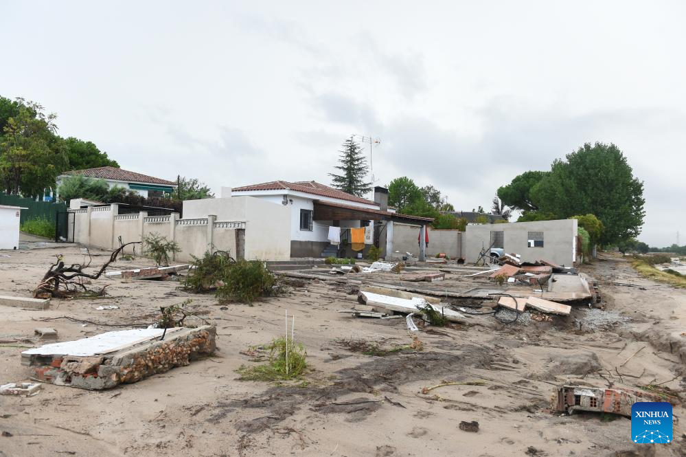 A broken house is seen after storms in Villamanta of Madrid, Spain, Sept. 4, 2023. Spain's State Meteorological Agency (AEMET) has declared a red alert for extreme weather and heavy rainfall in central and eastern Spain on Sunday. (Photo by Gustavo Valiente/Xinhua)