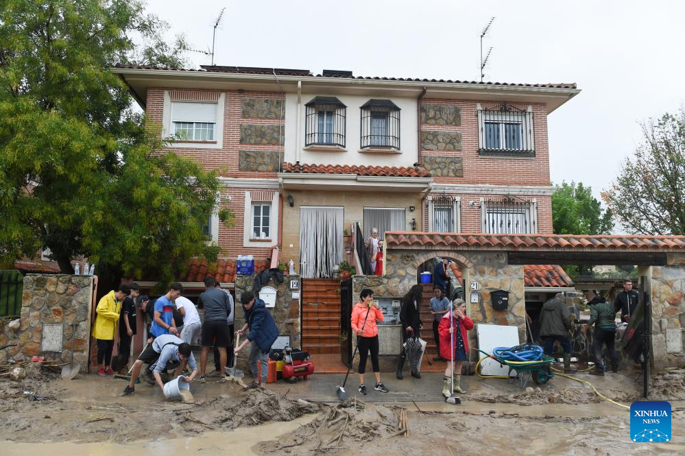 Residents clear up a road after storms in Villamanta of Madrid, Spain, Sept. 4, 2023. Spain's State Meteorological Agency (AEMET) has declared a red alert for extreme weather and heavy rainfall in central and eastern Spain on Sunday. (Photo by Gustavo Valiente/Xinhua)