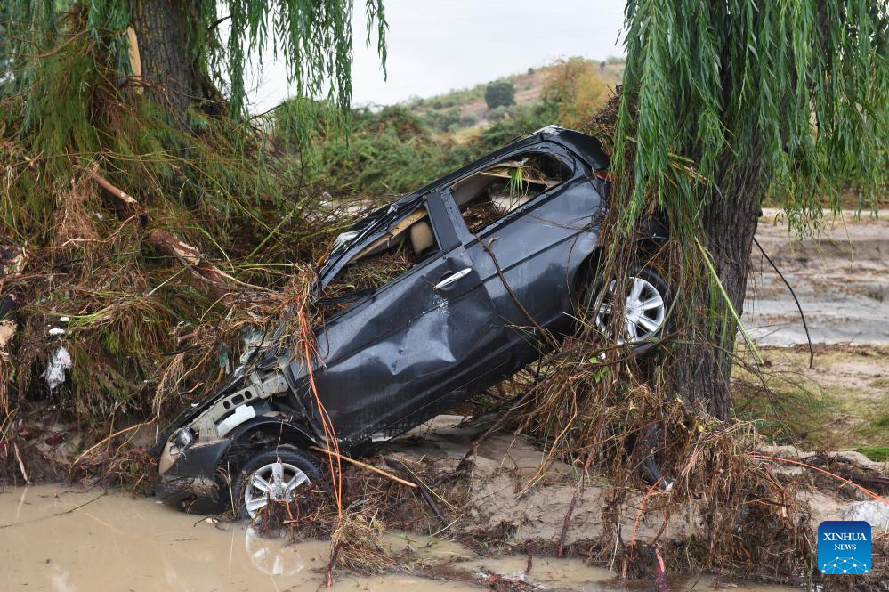 A broken vehicle is seen after storms in Villamanta of Madrid, Spain, Sept. 4, 2023. Spain's State Meteorological Agency (AEMET) has declared a red alert for extreme weather and heavy rainfall in central and eastern Spain on Sunday. (Photo by Gustavo Valiente/Xinhua)