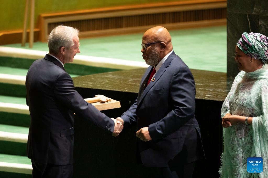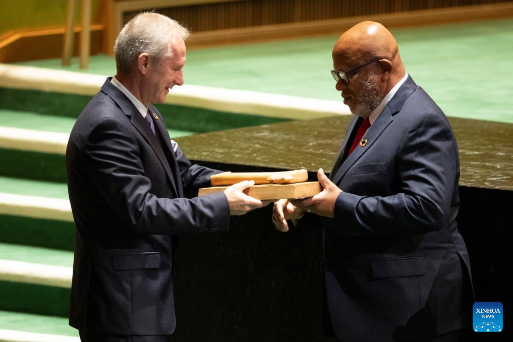 Csaba Korosi (L), president of the 77th session of the UN General Assembly, hands over the gavel to Dennis Francis (C), president of the 78th session of the UN General Assembly, at the UN headquarters in New York, on Sept. 5, 2023. The 77th session of the UN General Assembly (UNGA) on Tuesday concluded with the outgoing president calling for "cooperation on a global scale." (Xinhua/Xie E)