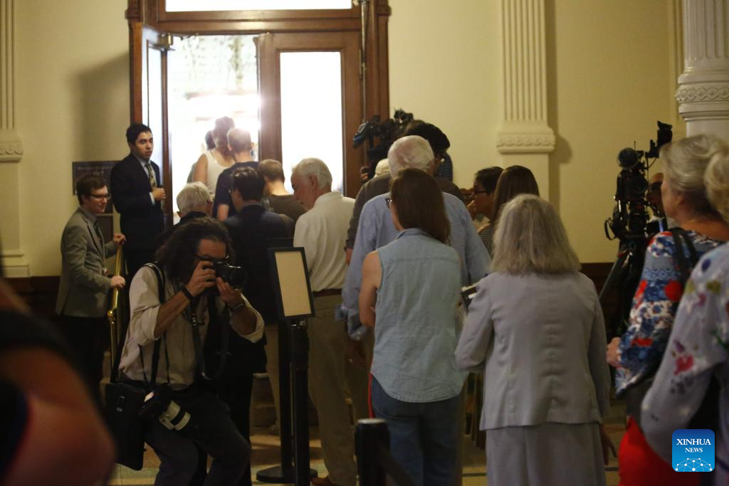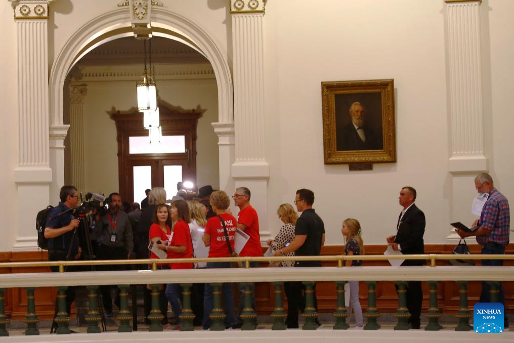 People line up to watch an impeachment trial of suspended state Attorney General Ken Paxton over yearslong charges in Austin, Texas, the United States, on Sept. 5, 2023. The Senate of the south-central U.S. state of Texas on Tuesday began an impeachment trial of suspended state Attorney General Ken Paxton, a Republican, over yearslong charges including corruption, lawbreaking and power abusing. (Photo by Chengyue Lao/Xinhua)
