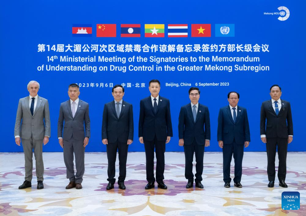 Chinese State Councilor and Minister of Public Security Wang Xiaohong poses for a group photo with the heads of delegations attending the 14th Ministerial Meeting of the Signatories to the Memorandum of Understanding on Drug Control in the Greater Mekong Subregion prior to the meeting in Beijing, capital of China, Sept. 6, 2023. Wang attended the meeting and delivered a keynote speech at the meeting. (Xinhua/Zhai Jianlian)