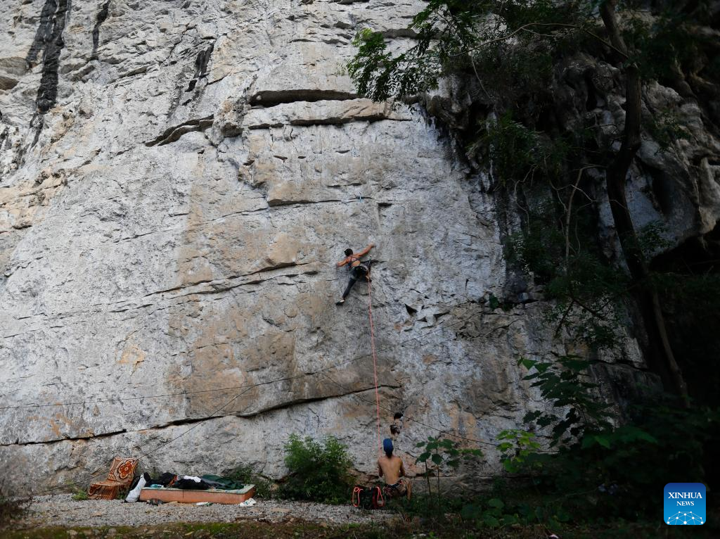 An enthusiast rock-climbs in Guilin, south China's Guangxi Zhuang Autonomous Region, Sept. 5, 2023. (Xinhua/Hu Xingyu)