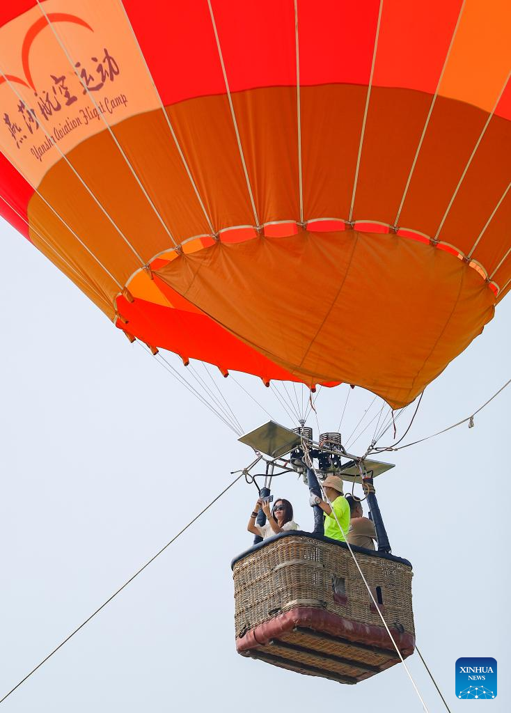 Tourists take a hot air balloon in Guilin, south China's Guangxi Zhuang Autonomous Region, Sept. 5, 2023. (Xinhua/Hu Xingyu)