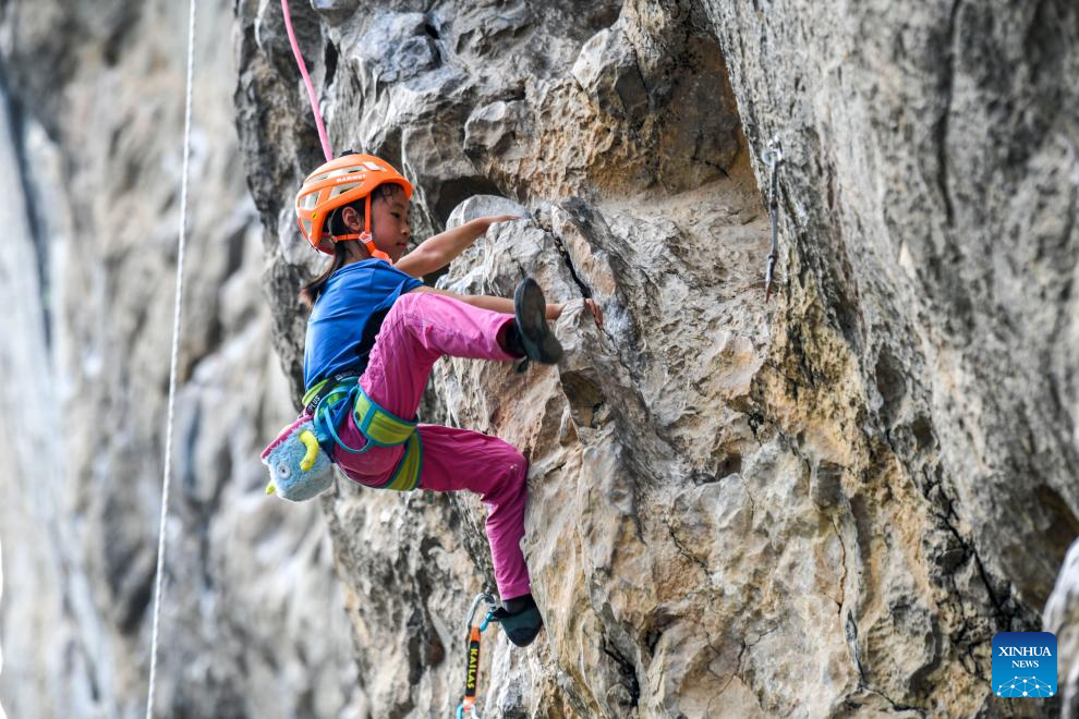 A child rock-climbs in Guilin, south China's Guangxi Zhuang Autonomous Region, May 6, 2023. (Xinhua/Cao Yiming)