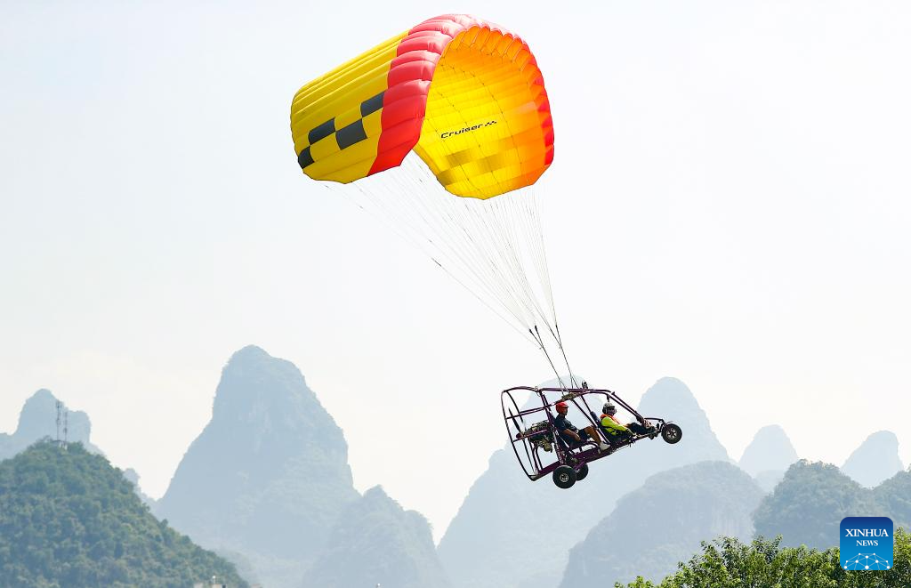 A tourist parasails with a coach in Guilin, south China's Guangxi Zhuang Autonomous Region, Sept. 5, 2023. (Xinhua/Hu Xingyu)