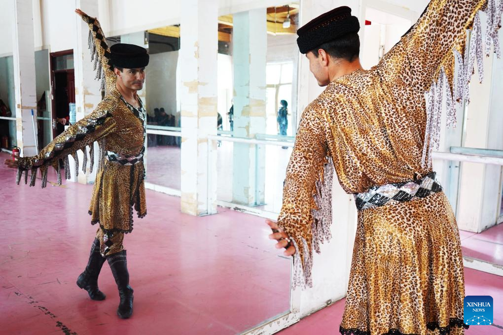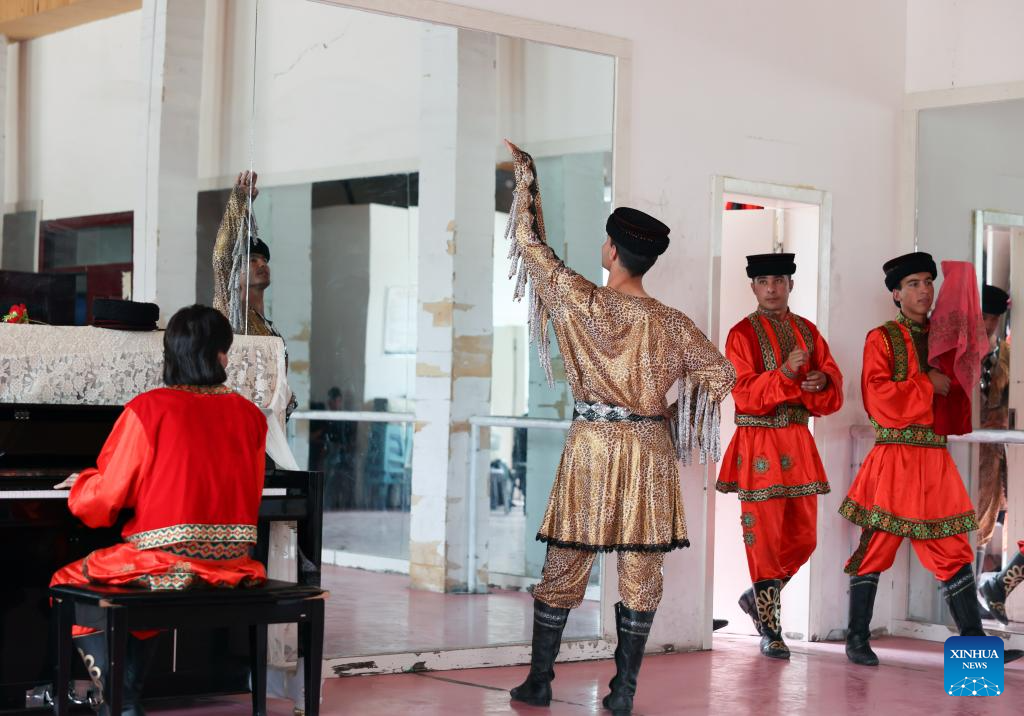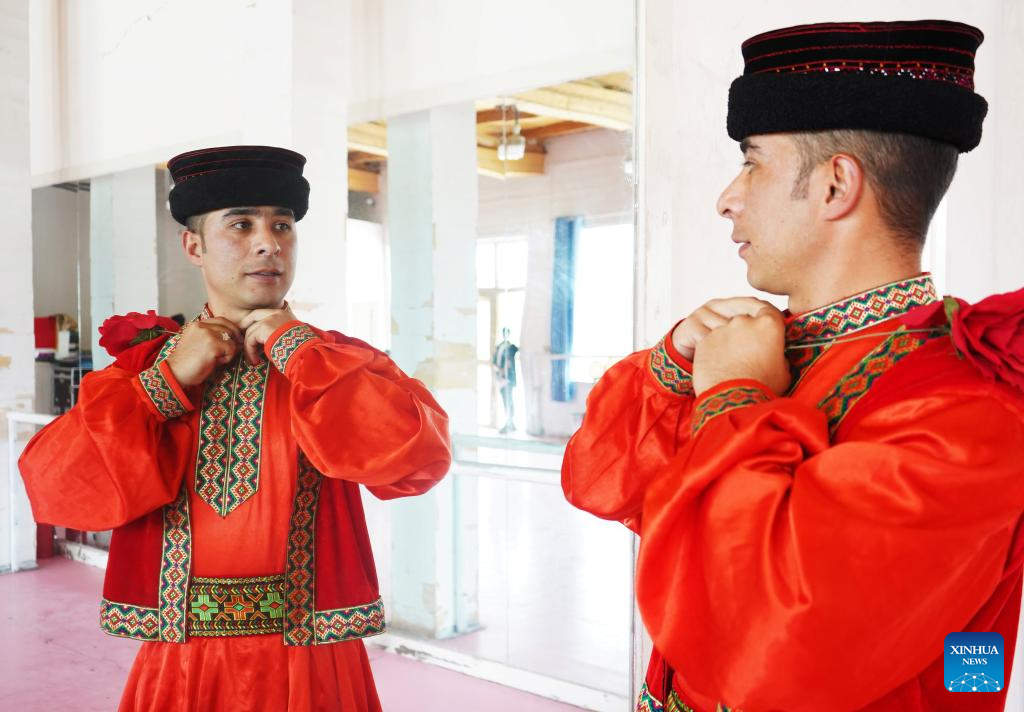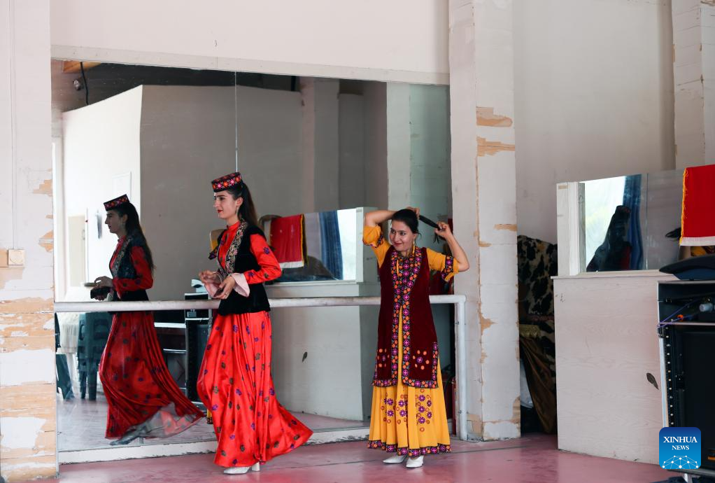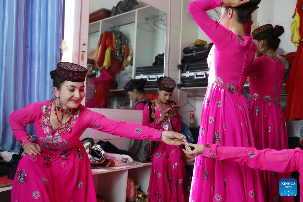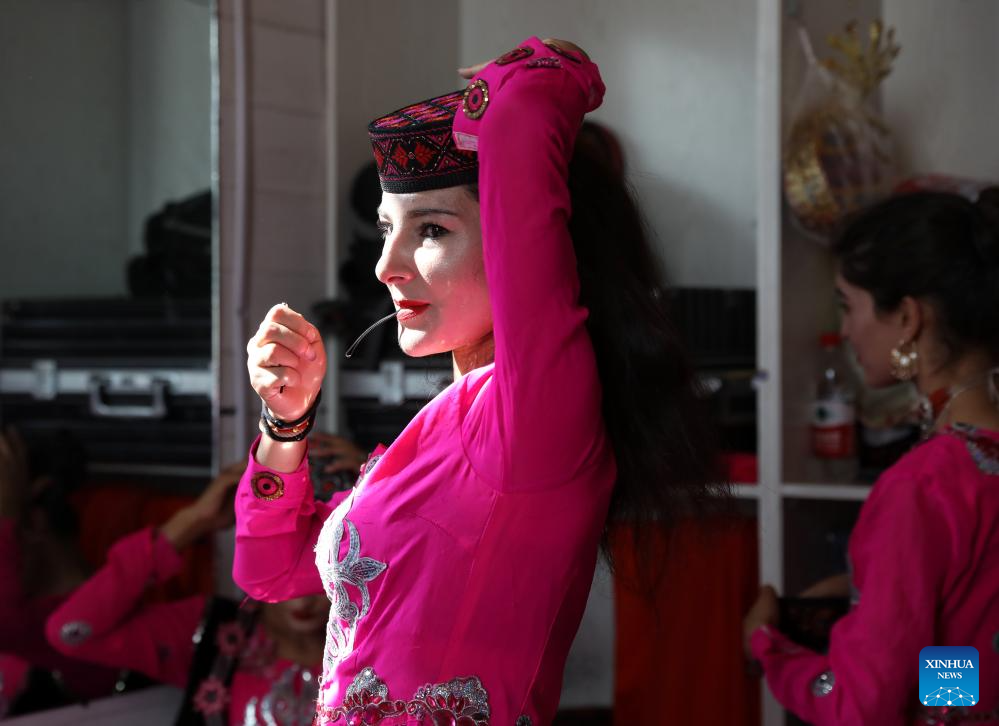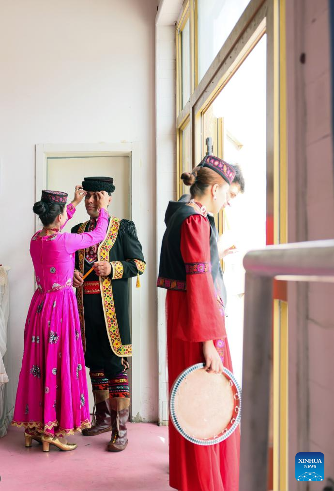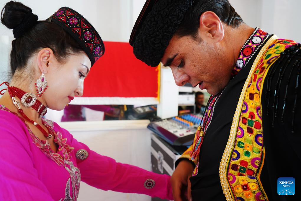 Members of a local song and dance ensemble get prepared before a performance at the customer service center of Pamir Tourist Area in Taxkorgan Tajik Autonomous County, northwest China's Xinjiang Uygur Autonomous Region, Sept. 4, 2023. Taxkorgan, a border county home to no more than 50,000 residents, is renowned for its tourist attractions, and it has received more than 900,000 tourists in the first eight months of the year. (Xinhua/Jin Haoyuan)