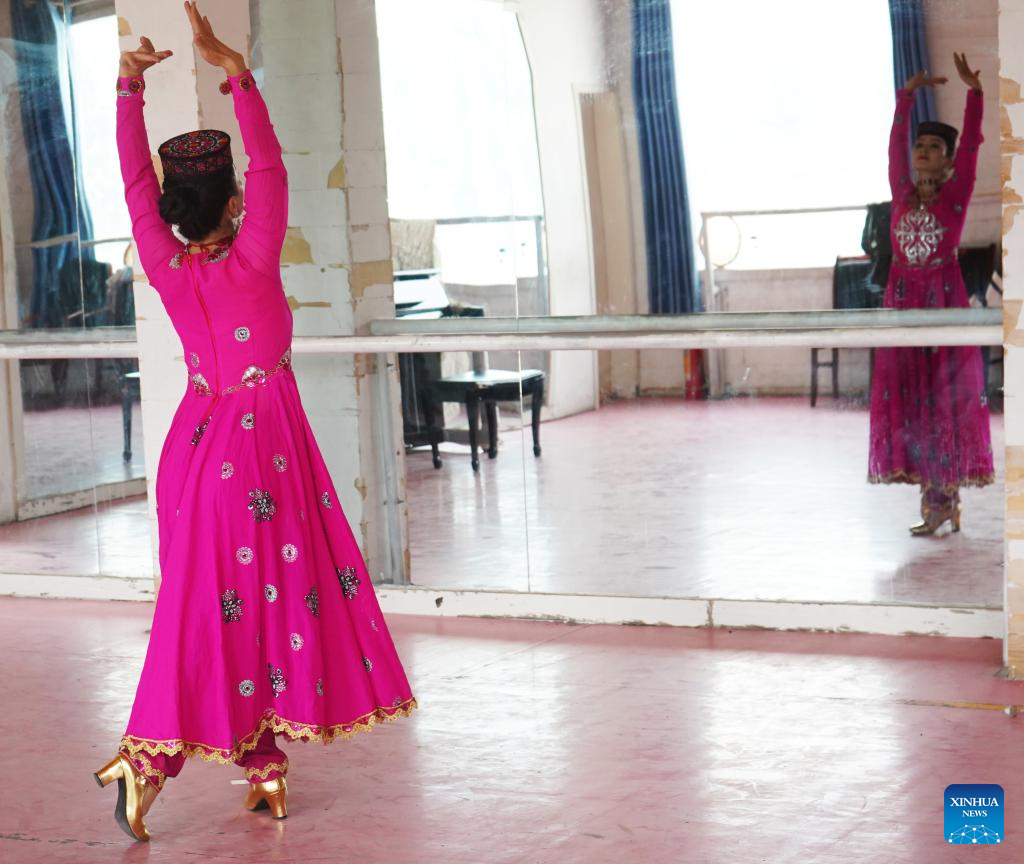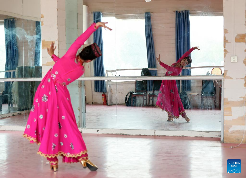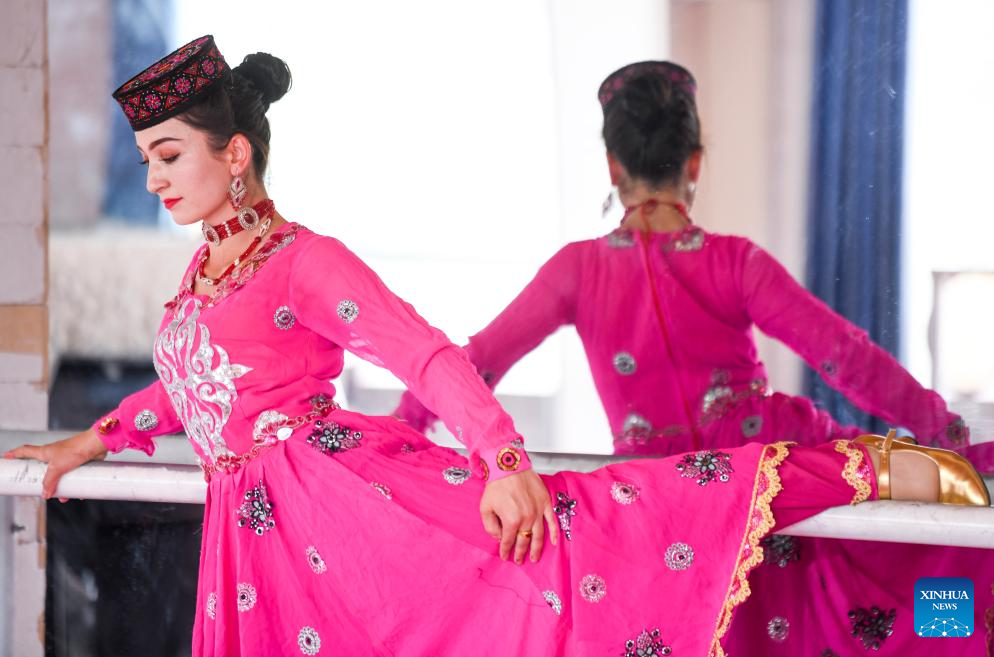 A member of a local song and dance ensemble dances to welcome tourists in front of the customer service center of Pamir Tourist Area in Taxkorgan Tajik Autonomous County, northwest China's Xinjiang Uygur Autonomous Region, Sept. 4, 2023. Taxkorgan, a border county home to no more than 50,000 residents, is renowned for its tourist attractions, and it has received more than 900,000 tourists in the first eight months of the year. (Xinhua/Cheng Tingting)