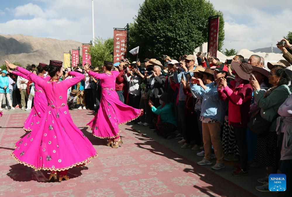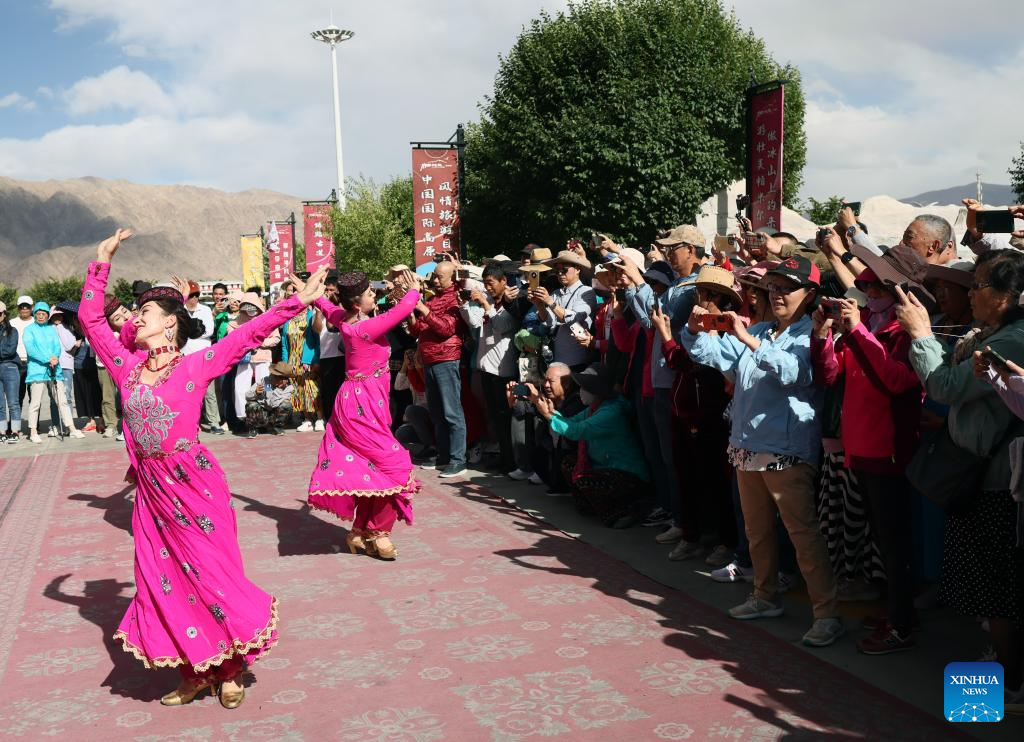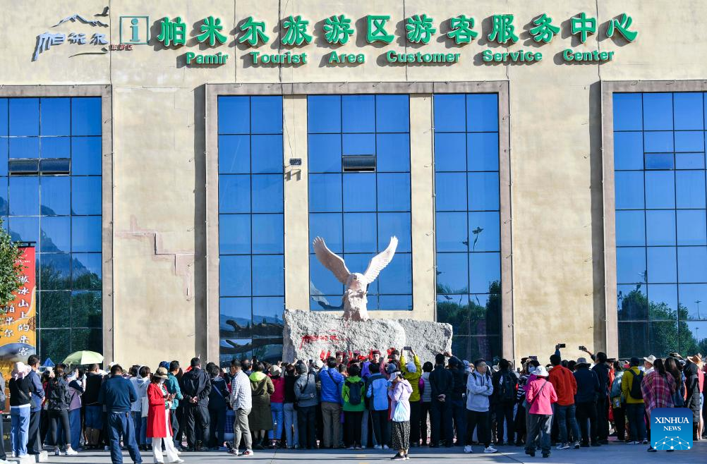 Tourists watch performance in front of the customer service center of Pamir Tourist Area in Taxkorgan Tajik Autonomous County, northwest China's Xinjiang Uygur Autonomous Region, Aug. 31, 2023. Taxkorgan, a border county home to no more than 50,000 residents, is renowned for its tourist attractions, and it has received more than 900,000 tourists in the first eight months of the year. (Xinhua/Hu Huhu)
