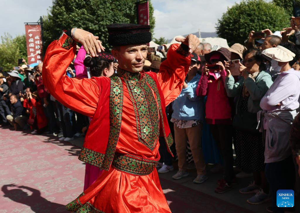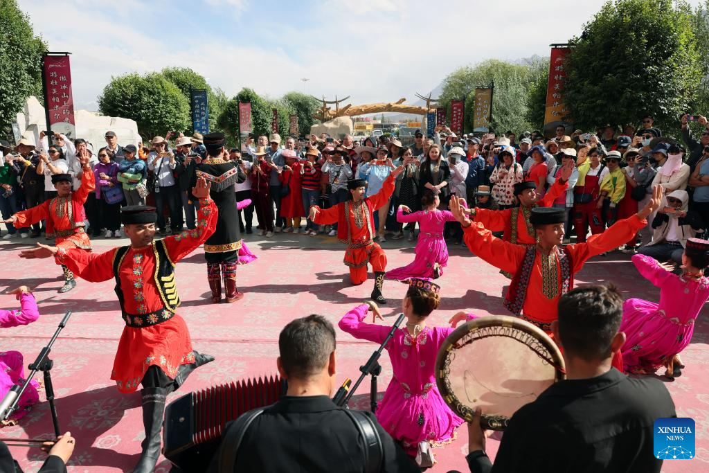 Members of a local song and dance ensemble perform to welcome tourists in front of the customer service center of Pamir Tourist Area in Taxkorgan Tajik Autonomous County, northwest China's Xinjiang Uygur Autonomous Region, Sept. 4, 2023. Taxkorgan, a border county home to no more than 50,000 residents, is renowned for its tourist attractions, and it has received more than 900,000 tourists in the first eight months of the year. (Xinhua/Lan Hongguang)