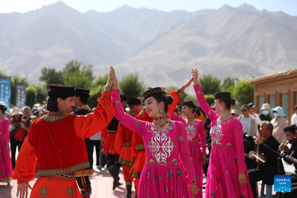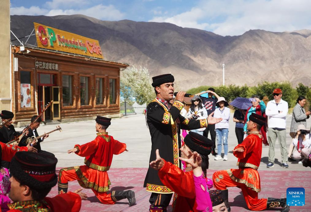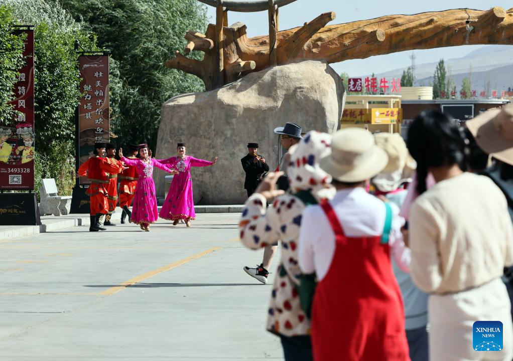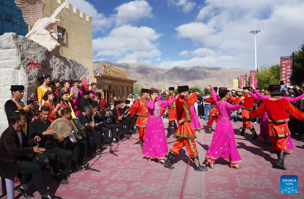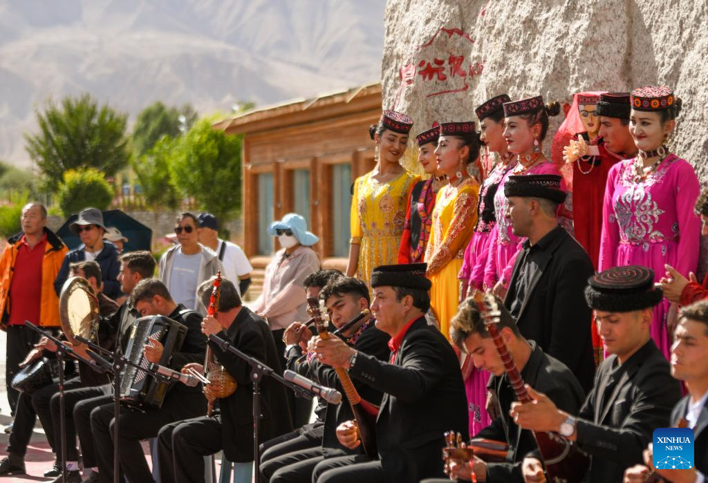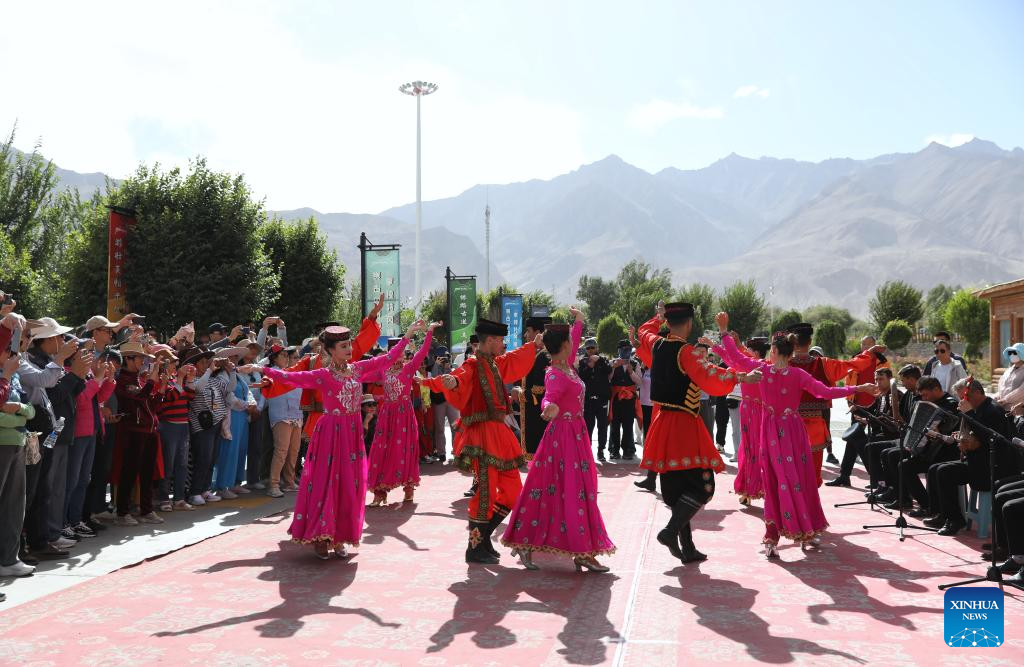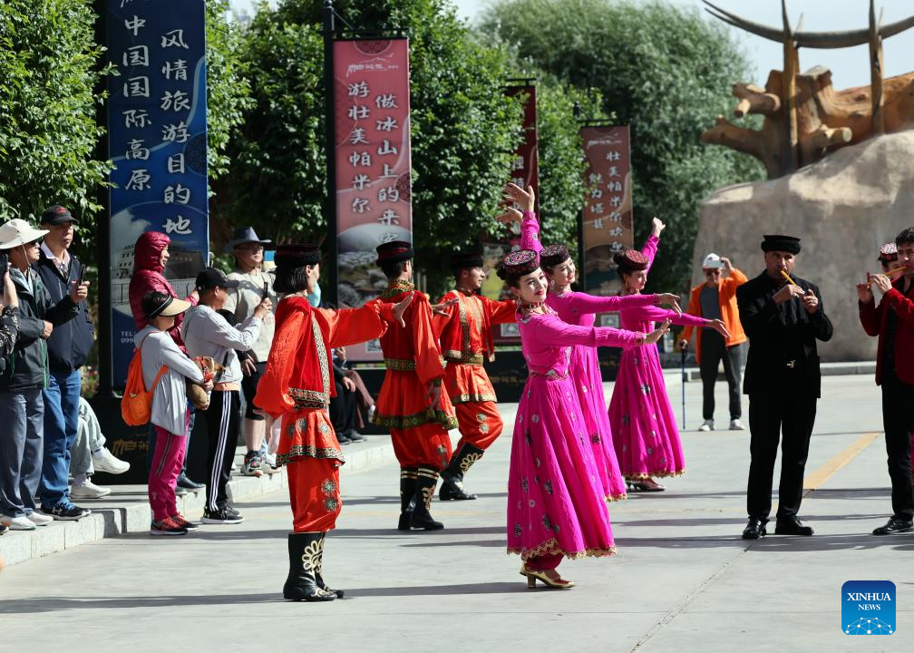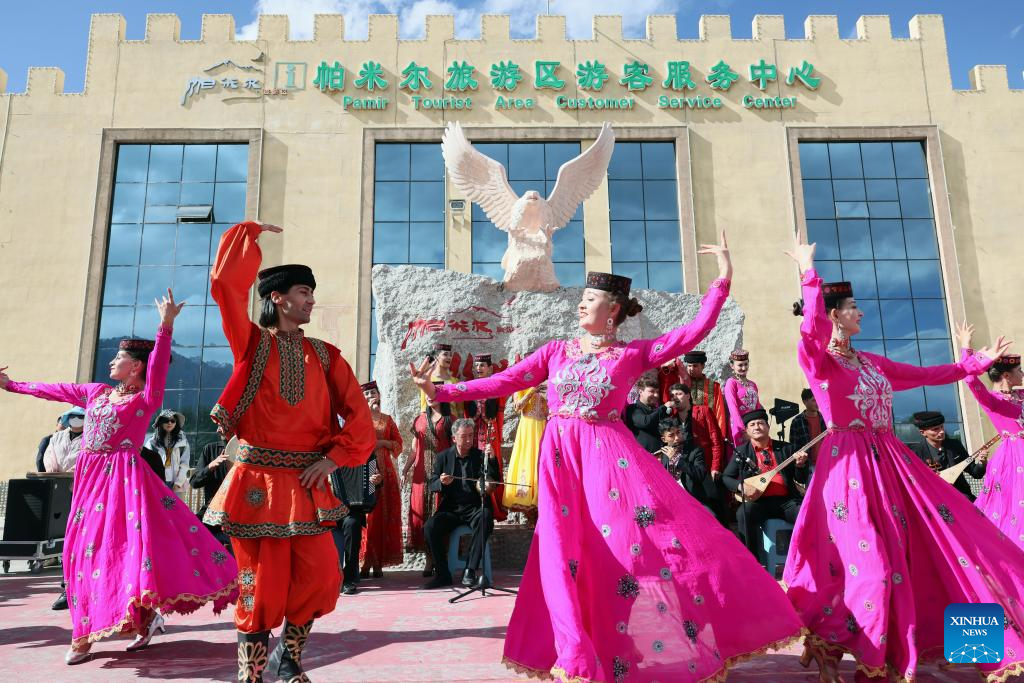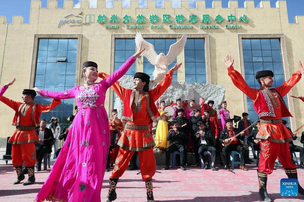 Members of a local song and dance ensemble perform to welcome tourists in front of the customer service center of Pamir Tourist Area in Taxkorgan Tajik Autonomous County, northwest China's Xinjiang Uygur Autonomous Region, Sept. 4, 2023. Taxkorgan, a border county home to no more than 50,000 residents, is renowned for its tourist attractions, and it has received more than 900,000 tourists in the first eight months of the year. (Xinhua/Jin Haoyuan)