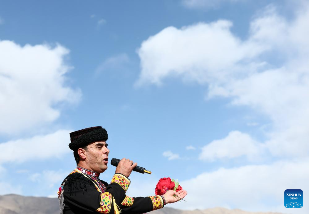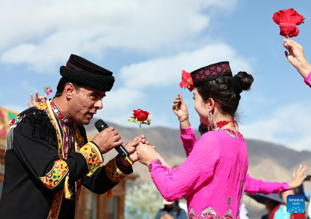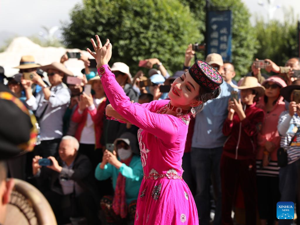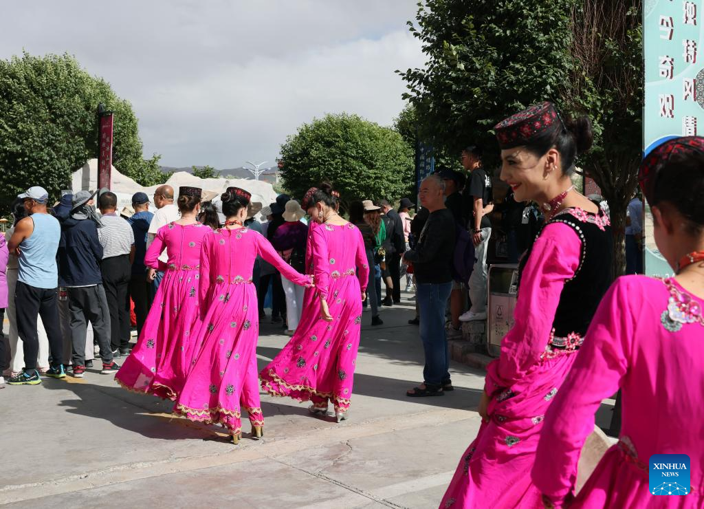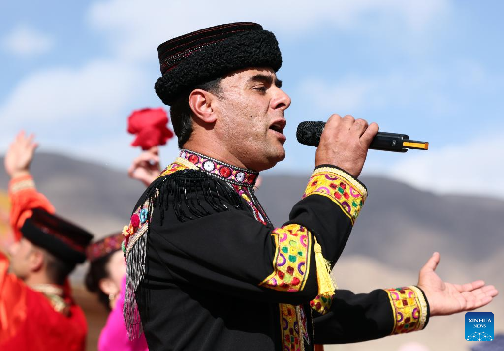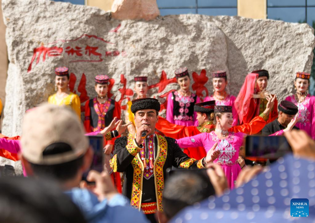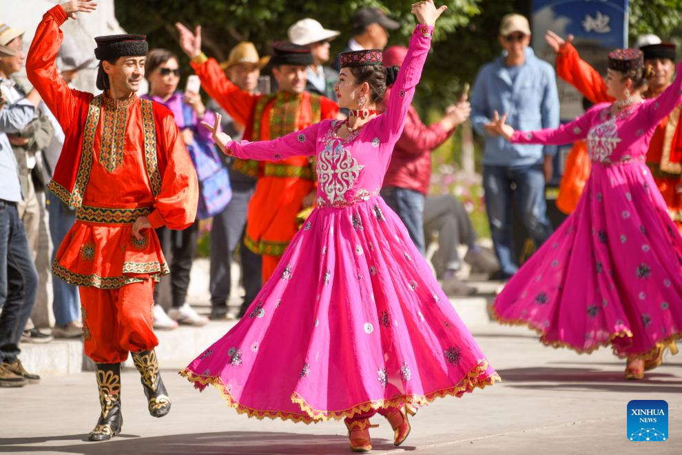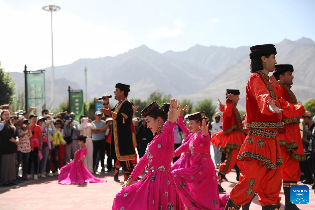 Members of a local song and dance ensemble perform to welcome tourists in front of the customer service center of Pamir Tourist Area in Taxkorgan Tajik Autonomous County, northwest China's Xinjiang Uygur Autonomous Region, Sept. 4, 2023. Taxkorgan, a border county home to no more than 50,000 residents, is renowned for its tourist attractions, and it has received more than 900,000 tourists in the first eight months of the year. (Xinhua/Jin Haoyuan)
