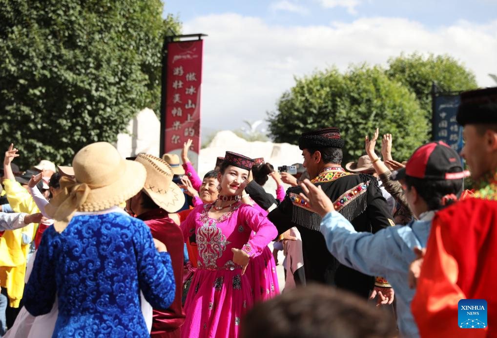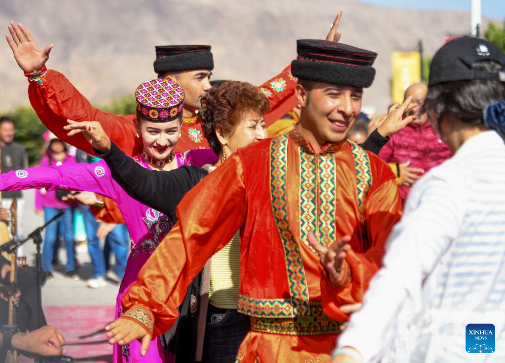 Members of a local song and dance ensemble dance with tourists in front of the customer service center of Pamir Tourist Area in Taxkorgan Tajik Autonomous County, northwest China's Xinjiang Uygur Autonomous Region, Sept. 4, 2023. Taxkorgan, a border county home to no more than 50,000 residents, is renowned for its tourist attractions, and it has received more than 900,000 tourists in the first eight months of the year. (Xinhua/Lan Hongguang)