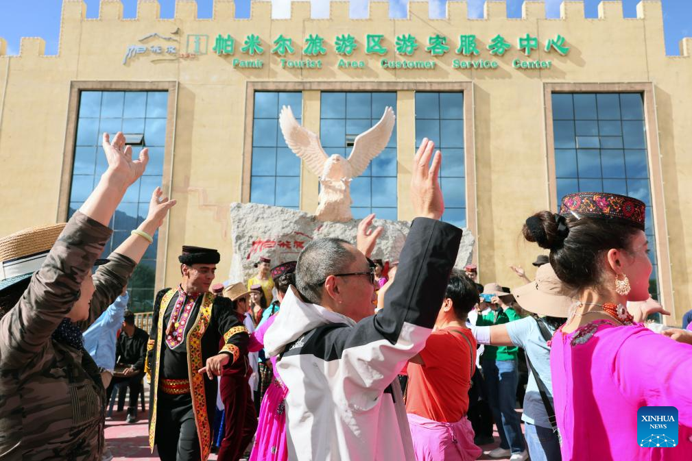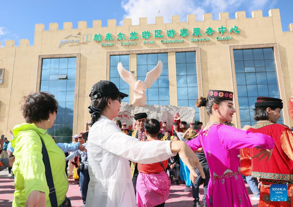 Members of a local song and dance ensemble dance with tourists in front of the customer service center of Pamir Tourist Area in Taxkorgan Tajik Autonomous County, northwest China's Xinjiang Uygur Autonomous Region, Sept. 4, 2023. Taxkorgan, a border county home to no more than 50,000 residents, is renowned for its tourist attractions, and it has received more than 900,000 tourists in the first eight months of the year. (Xinhua/Hu Huhu)