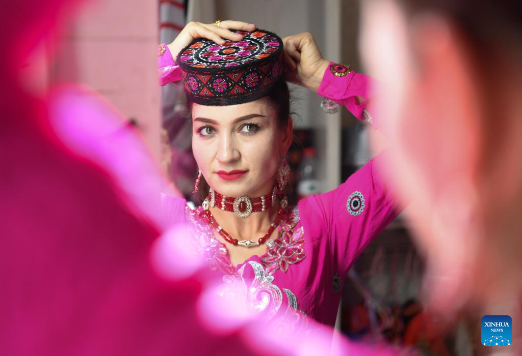 A member of a local song and dance ensemble gets prepared before a performance at the customer service center of Pamir Tourist Area in Taxkorgan Tajik Autonomous County, northwest China's Xinjiang Uygur Autonomous Region, Sept. 4, 2023. Taxkorgan, a border county home to no more than 50,000 residents, is renowned for its tourist attractions, and it has received more than 900,000 tourists in the first eight months of the year. (Xinhua/Wang Fei)