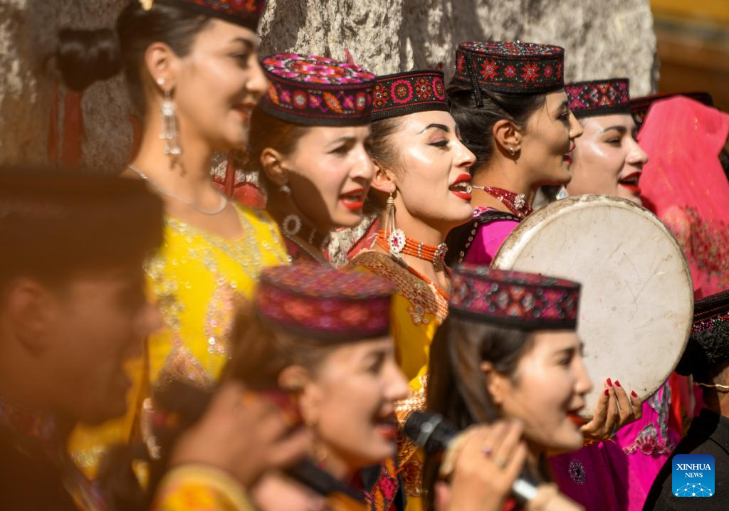Members of a local song and dance ensemble sing to welcome tourists in front of the customer service center of Pamir Tourist Area in Taxkorgan Tajik Autonomous County, northwest China's Xinjiang Uygur Autonomous Region, Sept. 4, 2023. Taxkorgan, a border county home to no more than 50,000 residents, is renowned for its tourist attractions, and it has received more than 900,000 tourists in the first eight months of the year. (Xinhua/Wang Fei)
