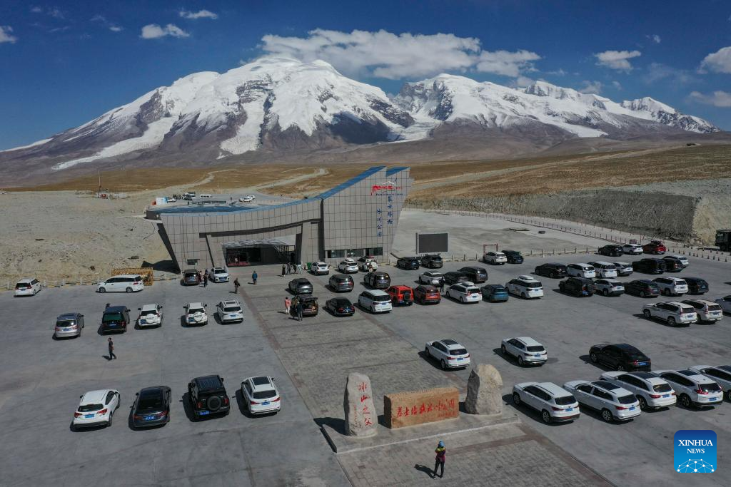 This aerial photo taken on Sept. 1, 2023 shows a parking area in front of the Muztagata glacier park in Taxkorgan Tajik Autonomous County, northwest China's Xinjiang Uygur Autonomous Region. Taxkorgan, a border county home to no more than 50,000 residents, is renowned for its tourist attractions, and it has received more than 900,000 tourists in the first eight months of the year. (Xinhua/Hu Huhu)