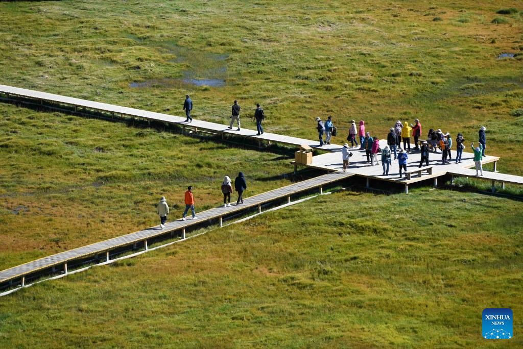 Tourists are pictured at a wetland park in Taxkorgan Tajik Autonomous County, northwest China's Xinjiang Uygur Autonomous Region, Aug. 28, 2023. Taxkorgan, a border county home to no more than 50,000 residents, is renowned for its tourist attractions, and it has received more than 900,000 tourists in the first eight months of the year. (Xinhua/Hu Huhu)