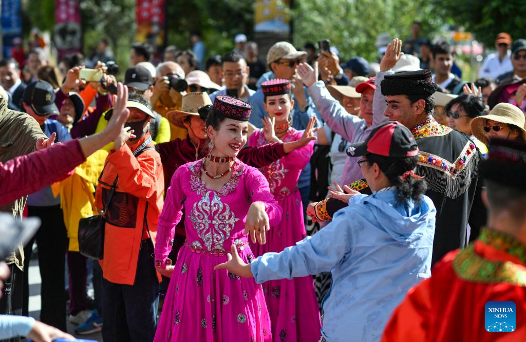 Members of a local song and dance ensemble dance with tourists in front of the customer service center of Pamir Tourist Area in Taxkorgan Tajik Autonomous County, northwest China's Xinjiang Uygur Autonomous Region, Sept. 4, 2023. Taxkorgan, a border county home to no more than 50,000 residents, is renowned for its tourist attractions, and it has received more than 900,000 tourists in the first eight months of the year. (Xinhua/Cheng Tingting)