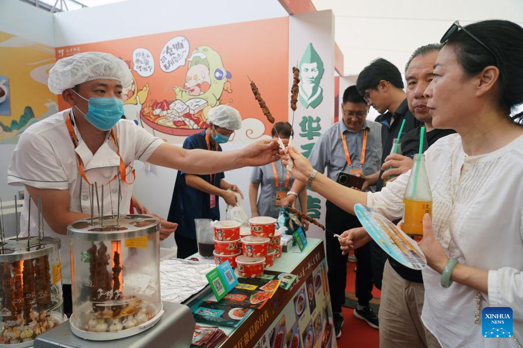 Visitors try snacks at the exhibition hall of Beijing time-honored brand during the 2023 China International Fair for Trade in Services (CIFTIS) in Beijing, capital of China, Sept. 6, 2023. A number of time-honored brands in catering business made their debut at the exhibition hall of Beijing time-honored brand during the 2023 CIFTIS, attracting numerous guests to come for a taste. (Xinhua/Ren Chao)