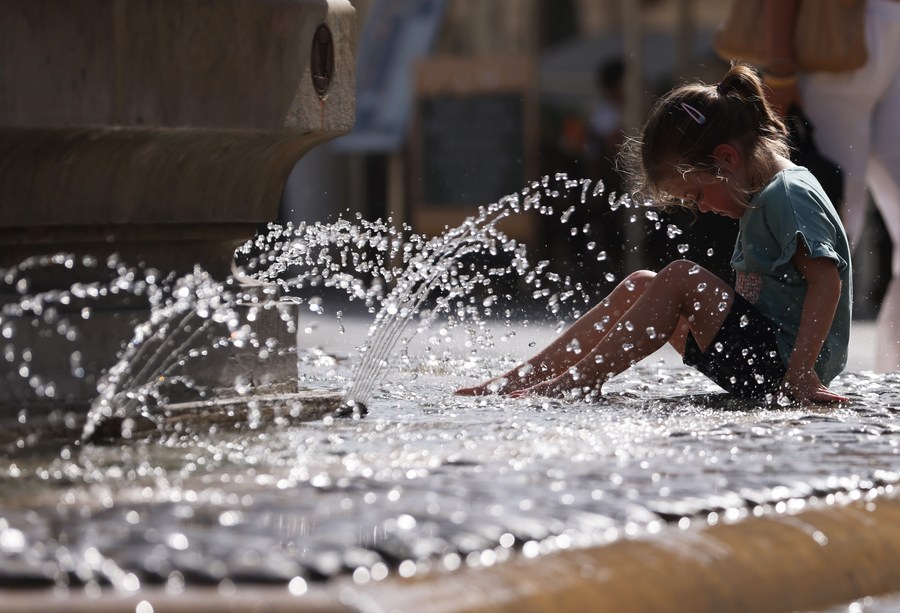 A girl cools herself at a fountain of Three Graces on the Place de Comedie as the highest temperature reaches 38 degrees Celsius in Montpellier, southern France, July 19, 2023. (Xinhua/Gao Jing)