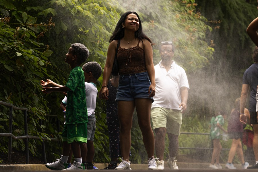 People cool themselves under a water cooling station at the Smithsonian National Zoo in Washington, D.C., the United States, July 26, 2023. (Photo by Aaron Schwartz/Xinhua)