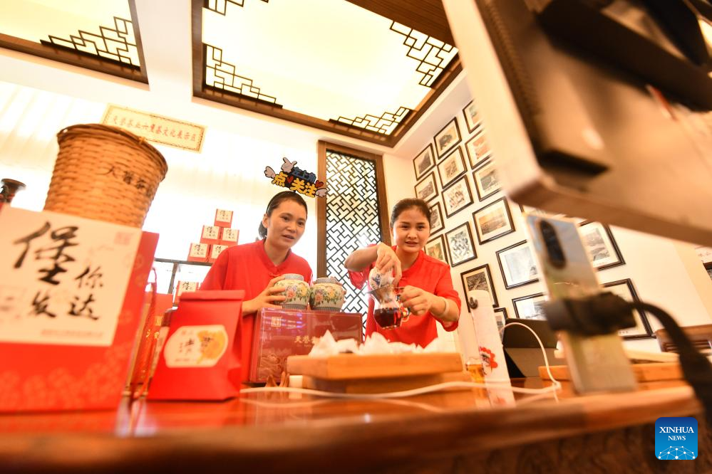 Staff members sell tea products via livestreaming in a tea company in Wuzhou City, south China's Guangxi Zhuang Autonomous Region, Aug. 25, 2023.?(Xinhua/Huang Xiaobang)