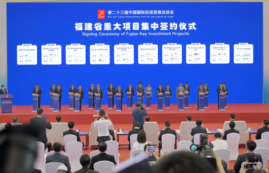 This photo taken on Sept. 8, 2023 shows the Signing Ceremony of Fujian Key Investment Projects during the 23rd China International Fair for Investment and Trade (CIFIT) in Xiamen, east China's Fujian Province. (Xinhua/Lin Shanchuan)