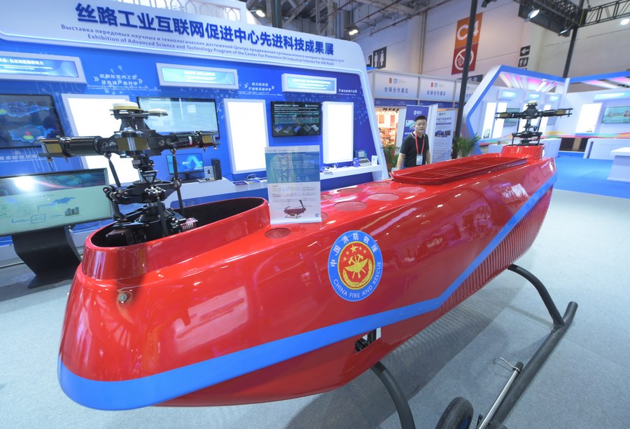 An unmanned helicopter is on display during the 23rd China International Fair for Investment and Trade (CIFIT) in Xiamen, east China's Fujian Province, Sept. 8, 2023. (Xinhua/Lin Shanchuan)