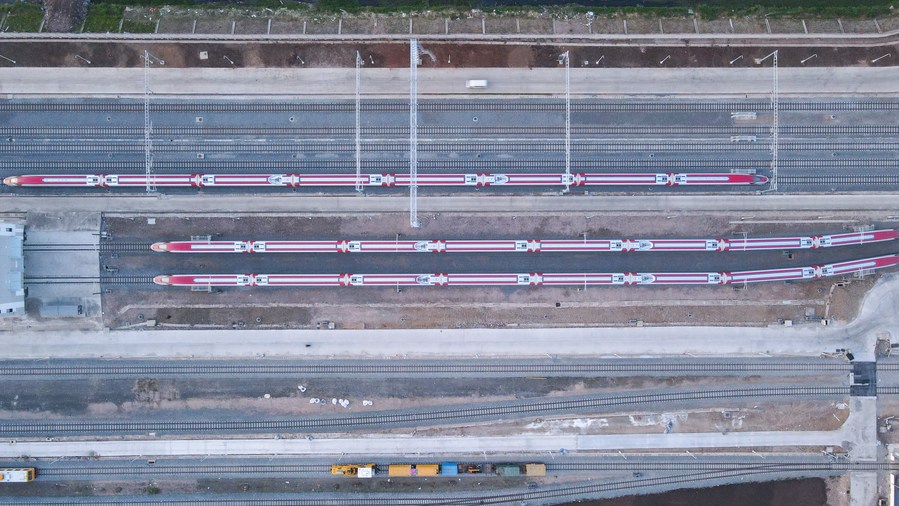 This aerial photo taken on July 20, 2023 shows trains of Jakarta-Bandung High-Speed Railway (HSR) parking near a train station in Bandung, Indonesia. (Xinhua/Xu Qin)